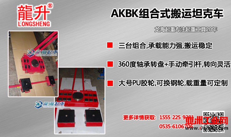 AKBK组合式搬运坦克车用于重型移运的工具,采用三台组合设计,承载能力强,经广大用户使用验证即使在重载情况下依然可以转向的一款组合式搬运小坦克。龙升品牌厂家直销,现货供应,保质12个月!!!