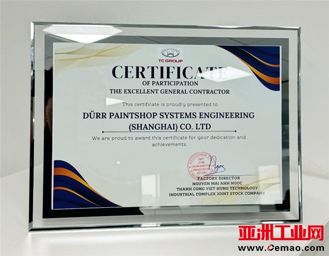 基于杜尔在项目中的出色表现, TC Motors近日授予杜尔中国“优秀供应商”称号。这一奖项彰显了双方在合作中展现的协同精神与专业技术。杜尔涂装系统工程(上海)有限公司项目经理王硕表示:“此次成功的关键在于杜尔中国与杜尔越南团队同客户之间的高效协作,各方共同努力确保了项目的圆满成功。我们对此荣誉深感自豪,它体现了团队为交付先进现代化工厂所展现的奉献精神与专业素养,正是这种精神助力我们克服了诸多挑战。”