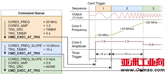 DDS 模式示例:只需几条指令即可生成正弦波(橙色)、加速频率(蓝色)以及降低振幅(绿色)