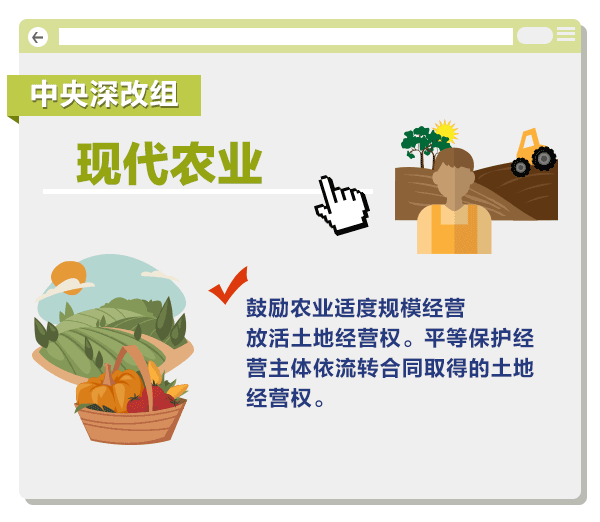针对这种情况,中央深改组提出要形成农村土地所有权、承包权、经营权三权分置、经营权流转的格局。此后,深改组还明确提出要放活土地经营权,在依法保护集体所有权和农户承包权的前提下,平等保护经营主体依流转合同取得的土地经营权,保障其有稳定的经营预期。一前一后两次出台文件,既为现代农业从业者消除了土地流转的障碍,同时也为其稳定经营吃下了一颗定心丸。