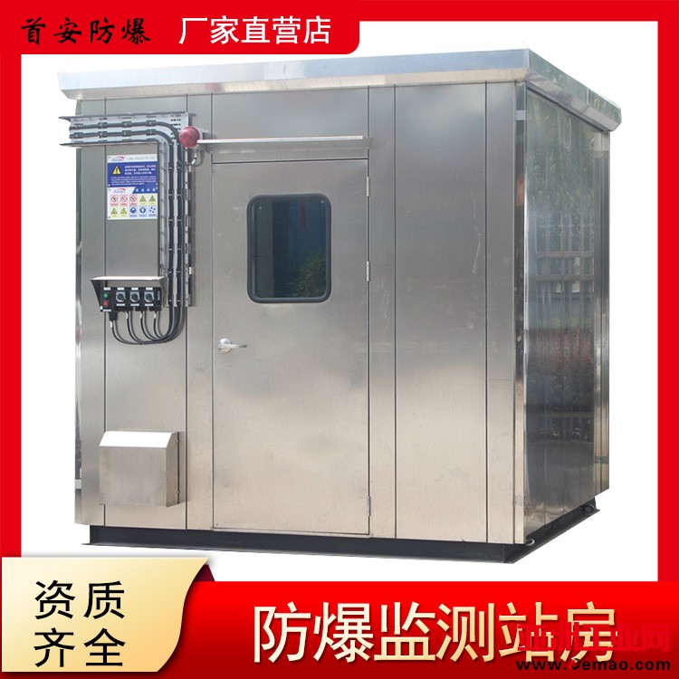 防爆监测站房就是是人们常说的防爆小屋,又叫防爆分析小屋。它是人们在石油化工环保等各行业中为检测有毒有害易燃易爆气体所设计制造的特殊房子,房子一般体积不大,多采用不锈钢或碳钢等钢材制作,房间内安装配电设备、照明设备、通风设备、分析仪等部件,如果作为临时避难的话,还要安装生命支持系统,语音联络监控系统等。防爆站房的材质采用1.2到1.5厚304不锈钢板制成,内墙一般采用1.2厚碳钢板或不锈钢板,不锈钢防爆站房底座采用12#U型槽钢焊接成型,底部焊接方管格栅,上方加焊防滑花纹钢板。不锈钢分析小屋在实用方面要优越于其他结构的分析小屋,具有更好的防腐、防潮等性能,现场安装更加方便,具有可回收性能,方便现场不使用可转移到别的地方。