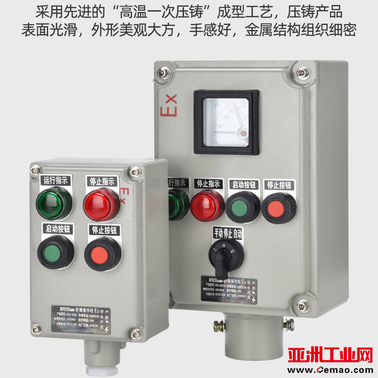 产品特点 1. 铸铝合金外壳,表面喷塑。 2. 内装转换开关、按钮、电流表(可按用要求装其他仪表)、指示灯。 3. 转换开关有30多种功能可由用户自由选择,可根据要求特制。 4. 开关操纵机构经过优化设计,可以自动找正,能能保证转动灵活,无卡滞现象。 5. 电流表量程由用户管理。 6. 钢管或电缆布线均可。 7. 产品出厂铭牌上只体现总单元内容,各分单元代号为订货参数。 8. 符合GB3836-2000,IEC60079标准要求。 用途 1.用途:本产品适用于含有爆炸性气体环境用的1区、2区危险场所,作为交流50Hz,电压至220/380V动力设备起动、停止控制使用。