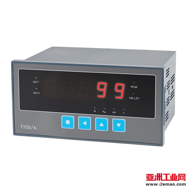 TY5D/A型五位单显测控仪表 ,是一种五位显示的称重仪表、称重显示仪表、称重显示控制测控仪表、称重显示器。TY5D/A型五位单显测控仪表的主要功能是实时显示力值,除此之外,还带两路继电器输出,可以设置报警值并输出开关量信号。
