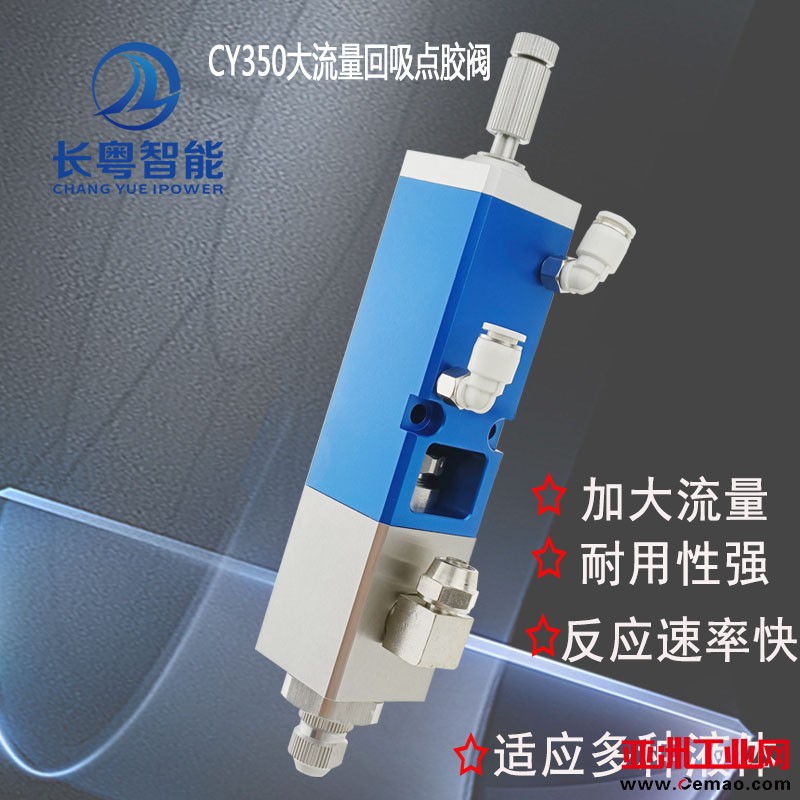 CY350 大流量回吸阀适用涂胶稳定胶量偏多的现场作业,具有润滑性的一般粘接剂、UV用粘接剂、硅胶、环氧树脂、黄胶,锡膏类等浓度高,流动性小,流量大的胶水使用。有调节螺母可调节流量大小,专用锁止螺母锁止调节机构,确保调整后稳定输出,便于调整涂胶量,回吸大,防止吐胶后拉丝。