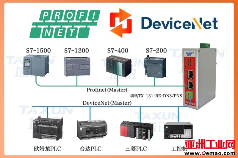 以塔讯 TX 131-RE-DNS/PNS 协议网关作为协议转换中枢,构建 “西门子 PLC→Profinet→网关(协议转换)→DeviceNet→基恩士 PLC” 的双向数据流转路径,同时网关将转换后的数据上传至工厂工业物联网平台,实现 “协议转换 + 数据监控” 一体化。
