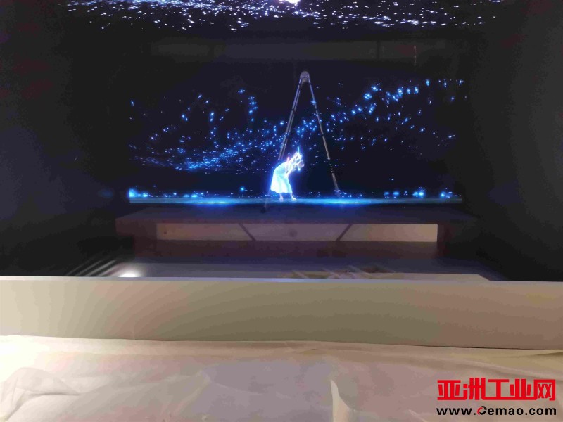 1: 幻影成像展示系统主要由实物展示台(也称实物模型)、成像光源(投影机或者Led屏等显示设备)、3D 视频、幻影成像膜、计算机多媒体系统。